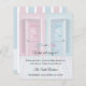 A budget baby shower or gender reveal invitation. The design consists of light pink and blue restroom doors, titled ladies and gents, with a baby in a pink and blue nappy respectively. The typography text reads he or she, what will baby be? Personalize by adding your full event and contact details to the front and back.