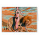 3D digital render of a beautiful young woman and a lion on a desert landscape background