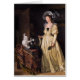 A lady in a gold dress has a lively white cat. It is an interesting picture of wealth. It is by French painter Fragonard.