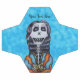 This soccer ball has a smiling lady Day of the Dead skeleton with long black hair wearing an orange and blue cape holding a bouquet of white flowers on a patterned bright aqua blue background. Customise your text with the template.