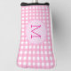 This customisable ladies putter golf head cover features pink gingham with a personalizable monogram. It's a stylish pink accessory that would be a good gift for any woman who plays golf.