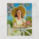 Classic PinUp card showing a beautiful Pin-Up girl in the spring time surrounded by blossom and pink roses, painted by Art Frahm (1907-1981)