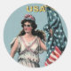 Round sticker with a vintage image of Lady Liberty wearing a flowing white gown and holding an American flag with her left hand. See matching rectangular sticker, greeting card, confetti and wrapping paper. See the entire Independence Day Sticker collection under the CARDS & STICKERS category in the HOLIDAYS section.