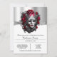 A beautiful watercolor ai graphic featuring a woman wearing a faux silver Venetian eye mask that has ornate decorative detail on it and large red and deep burgundy coloured rose flowers. She is set against a stark white background that makes her pop. Editable black text templates may be personalised to suit your requirements. This realistic 3D illustration is ideal for a masquerade, carnival, circus or festival bridal shower, bachelorette or birthday party.