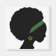 Silhouette of a lady with a big afro. Red gold and green rasta colours.