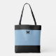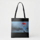 "Lady with Umbrella" blue and black tote bag offers a calm and reflective scene of a woman walking in the rain holding a bright red umbrella. Part of the Painted Girl series of original hand painted art on the things that you love.