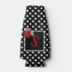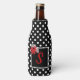 Fun black and white polka dot bottle cooler with cute graphics of a red and black ladybug sitting on the edge of a black text square. Personalise the red one letter monogram for yourself or as a cute gift idea for her.