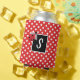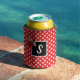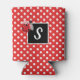 Fun red and white polka dot can cooler with cute graphics of a red and black ladybug sitting on the edge of a black text square. Personalise the white one letter monogram for yourself or as a cute gift idea for her.