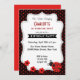 Birthday invitation with ladybug theme and polkadot background. The colour combination is bold red and black.