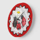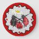 Cute, whimsical art featuring mum, dad and baby ladybug out for a stroll in the garden. Mrs. Ladybug has a daisy flower umbrella. Wavy edge red border. Larger red dots show positions of 12, 3, 6 and 9. Smaller red dots indicate the other hours in a day.