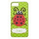 Cute original red ladybug / ladybird on a green polka flowers kids case. Reads Jenna or you can personalise with your own name. Exclusively designed by Sarah Trett.