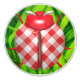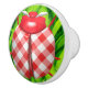 A red and white gingham check ladybug is set against a bright green background of dewy grass.