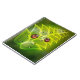Digital art depicting ladybugs on a glowing branch in bright green.