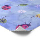 A cute springtime pattern. Red ladybugs with black spots, green and yellow leaves floating around, cute pink daisies, and lavender butterflies make up this delicate and dainty pattern on a bluish purple background.