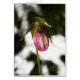A close up photograph of a pink Lady's Slipper that has grown in the shade of a tree.