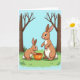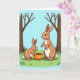 This card features two stylized rabbits in a sunny meadow scene, with the larger brown rabbit standing on the right and watching closely as the smaller one leans toward a bright orange bowl 🐰. The bigger rabbit’s creamy underside and soft pink inner ears frame its gentle, protective posture, while the little rabbit’s paws rest at the rim as if sharing a snack together. Both have large dark eyes with tiny lashes and a light blush on their cheeks, giving them a sweet, affectionate look that reads like close friendship. Behind them, simple bare tree trunks rise into a clear blue sky, keeping the setting open and calm. The foreground is filled with rich green grass dotted with small leafy shapes, adding texture without crowding the scene 🌷. A short Easter greeting appears near the top in a light, easy-to-read font, set in a soft contrasting color against the sky. The orange bowl sits low in the center foreground, between the rabbits, with their fluffy white tails visible against the green grass.