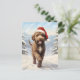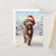 Colourful design of a Lagotto Romagnolo wearing a Santa hat walking through the snowy mountains and wishing Merry Christmas.