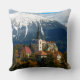 Photo throw pillow with the small Island with church surrounded by trees in fall colours in Lake Bled with in the background snow on the peaks of the Julian Alps in autumn in Slovenia.