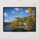 Photo postcard of Bled castle on a high cliff above Lake Bled, surrounded by trees with foliage in autumn colours in a beautiful fall landscape in Bled, Slovenia with a black edge and the text 'Bled'.