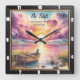 This serene square wall clock displays a tranquil lake scene at sunset, with soft pink and purple clouds reflecting on the water. A small wooden boat rests by the shore, featuring a blue bird. The inspiring "Be Still And Know That I Am God" text adds a peaceful, reflective spiritual touch to this beautiful natural landscape.