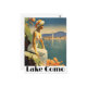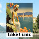 Transport yourself to the serene shores of Northern Italy with this stunning Lake Como design. This artistic illustration features a woman in a classic white gown looking out over the shimmering blue waters toward a picturesque Italian village and a prominent white bell tower.