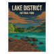 The image depicts a serene nighttime scene of Lake District National Park. A tranquil lake with a teal-blue surface stretches out in the foreground, bordered by a sandy shore dotted with large, dark rocks. Lush green trees line the shoreline, while towering, dark green mountains rise in the background.