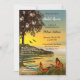 Bridal shower invitation featuring a painting of a coastal scene at sunset with a romantic blossoming tree and colorful butterflies. Beautiful for a celebration at the waterfront or with a butterfly theme.