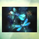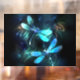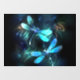 Two transparent, luminous, turquoise, artistically drawn dragonflies on night background with luminescent lake algae and fireflies. Glowing dragonfly.