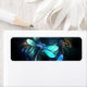 Two transparent, luminous, turquoise, artistically drawn dragonflies on night background with luminescent lake algae and fireflies. Glowing dragonfly.