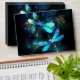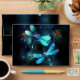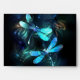 Two transparent, luminous, turquoise, artistically drawn dragonflies on night background with luminescent lake algae and fireflies. Glowing dragonfly.