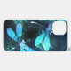 Two transparent, luminous, turquoise, artistically drawn dragonflies on night background with luminescent lake algae and fireflies. Glowing dragonfly.