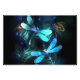 Two transparent, luminous, turquoise, artistically drawn dragonflies on night background with luminescent lake algae and fireflies. Glowing dragonfly.