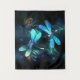 Two transparent, luminous, turquoise, artistically drawn dragonflies on night background with luminescent lake algae and fireflies. Glowing dragonfly.