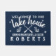 "Welcome to our lake house" text with canoe paddles, anchors, starfish, and your family name - Dark navy blue faux burlap background with white