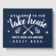 "Welcome to our lake house" text with space for your custom words, plus "guest book." Design includes canoe paddles, anchors, and starfish - Dark navy blue faux burlap background with white
