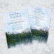 This scenic landscape wedding invitation card / details card combination features the image of a lightly rippled but calm lake, with distant lush evergreens, cedar trees and rock structures reflected upon its surface, and distant mountains under a blue sky with wispy clouds from the point of view of a paddler kayaking on the lake or a hiker on the opposite shore - mixed fonts text is a coordinating dark teal blue - personalise the wedding ceremony details on the front of the card; additional descriptive details are on the back of the card - easily add a website QR code using Zazzle's Design Tool - by katz_d_zynes