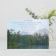 This rustic natural landscape wedding invitation card features an oil pastels sketch of a lightly rippled but calm lake, with distant evergreens, cedar trees and rock structures reflected upon its surface, and distant mountains under a blue sky with wispy clouds from the point of view of a paddler kayaking on the lake or a hiker on the opposite shore - mixed fonts text is a coordinating dark teal blue, as is the invitation back - by katz_d_zynes