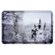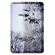 A photograph showing just a glimpse of the mountain lake through snow-covered fir trees. This landscape picture is digitally manipulated to look like a watercolor.
