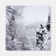 A photograph showing just a glimpse of the mountain lake through snow-covered fir trees. This landscape picture is digitally manipulated to look like a watercolor.