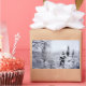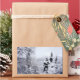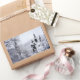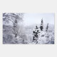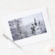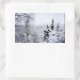 A photograph showing just a glimpse of the mountain lake through snow-covered fir trees. This landscape picture is digitally manipulated to look like a watercolor.