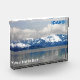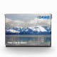 Looking east from Sandpoint, ID across Lake Pend Oreille (pond uh-ray) on a winter day; snow-covered mountains in the distance. Ice has formed at the shore and extends part way across the lake. Blues and greys are the predominate colours. Customisable text reading "IDAHO" also appears. And there is a place for you to add additional text.