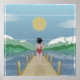 An illustration of a woman running along a wharf ready to jump into Lake Rotoiti. This is a lake in Nelson Lakes National Park, South Island New Zealand. Drawn in a retro pop art style this design has the look of folded and worn paper.