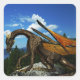 A dragon sits on a large boulder looking over a forest of pine trees towards a lake.