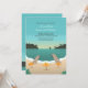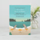 A scenic invitation that has a lake swimming area, beach umbrellas, docks, and a sailboat in the distance. Perfect for any lakeside celebration.