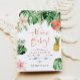 This baby shower invitation features beachy watercolor palm leaves, pink hibiscus florals and a cute tropical pineapple. This fun invite is the perfect addition to your Aloha luau themed girl baby shower party event. Pair with anything in the Lalani Collection for a cohesive look.