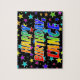 This fun, exciting, birthday-themed jigsaw puzzle design has the message "HAPPY BIRTHDAY, LANCE" with the characters having a colourful rainbow spectrum inspired gradient pattern, in addition to a lively field of stars background pattern. A vibrant puzzle like this might be used to send birthday greetings to somebody named Lance. [~Z0000468]