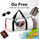 This white duffle bag features a powerful patriotic design with a majestic bald eagle in flight against a distressed American flag backdrop. The text "Land of the Free Because of the Brave" is prominently displayed below. This design is perfect for showing pride and gratitude for American freedom and military service. Edit colour of the bag caps and body in the Design tool to your favored colours.