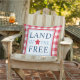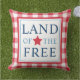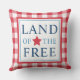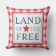 Square patriotic pillow features "Land of the Free" typography design with star accent and red gingham plaid border pattern. Red, white and navy blue colours.