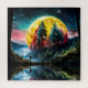 Large Colourful Moon Sets Down in the forest as a girl watches across a valley