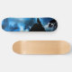 A skateboard that features a wolf howling on a steady rock. The board is mostly blue, with some black shades